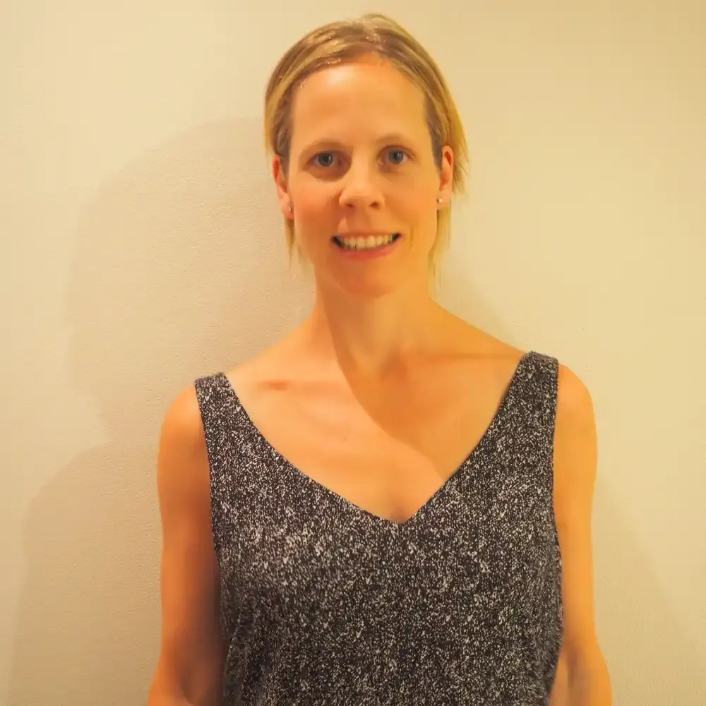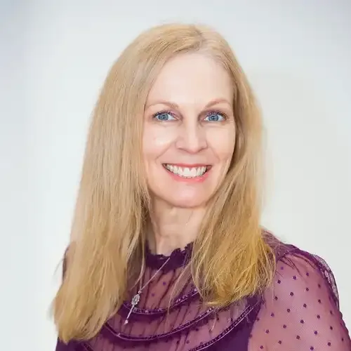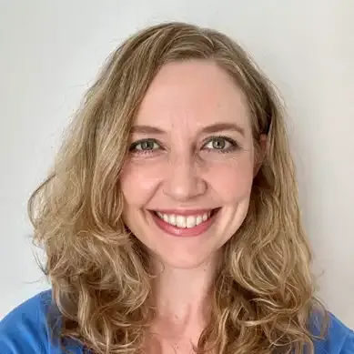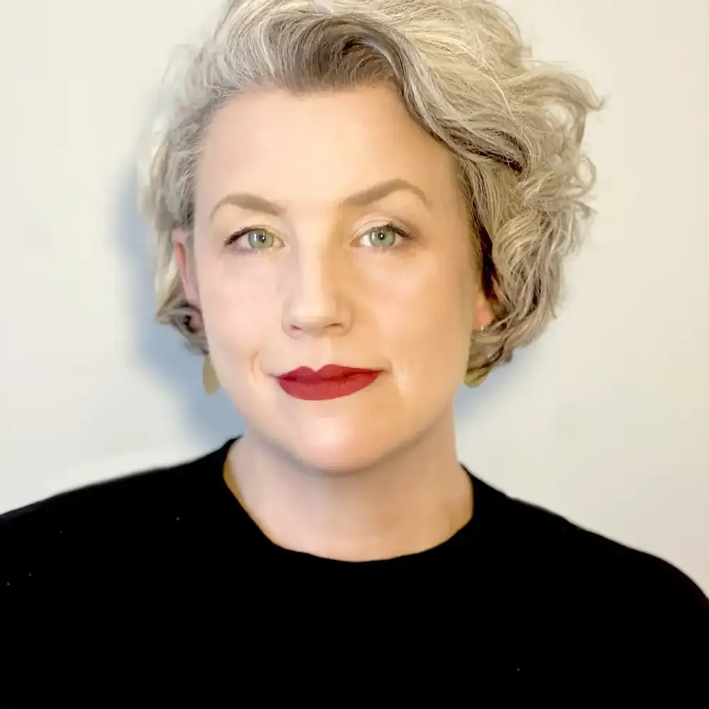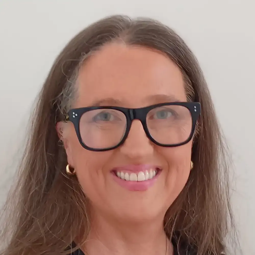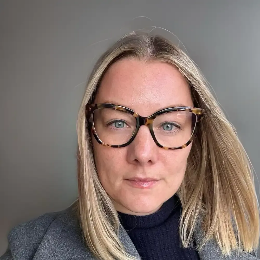A smiling woman with glasses and blonde hair is standing in front of a red wall.