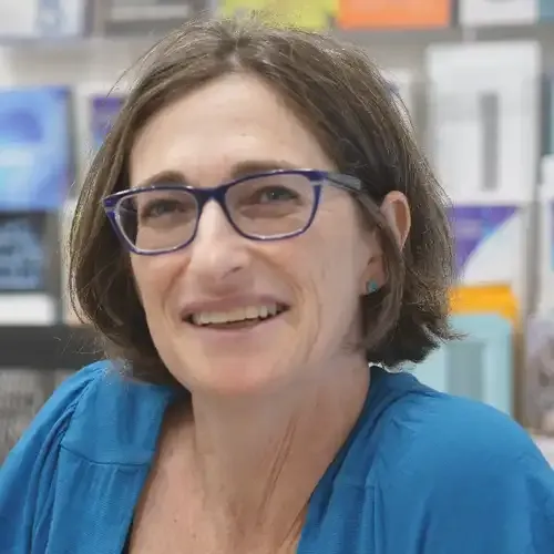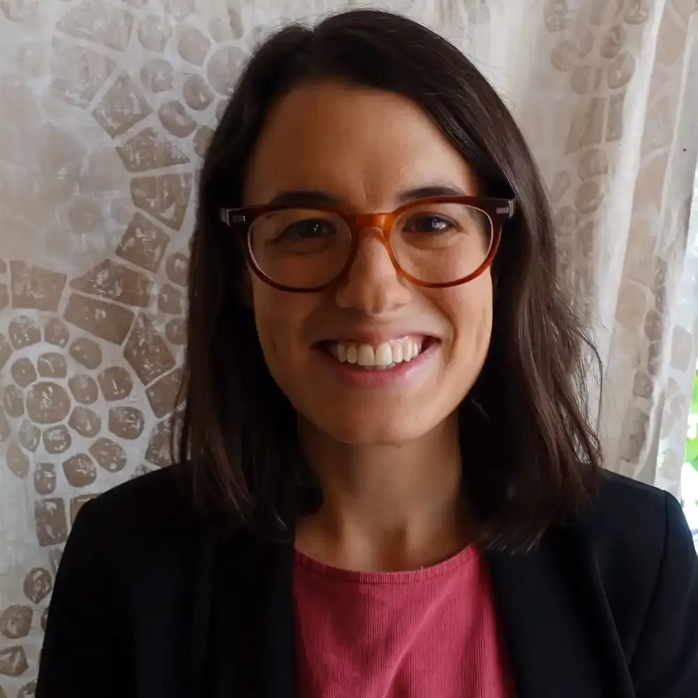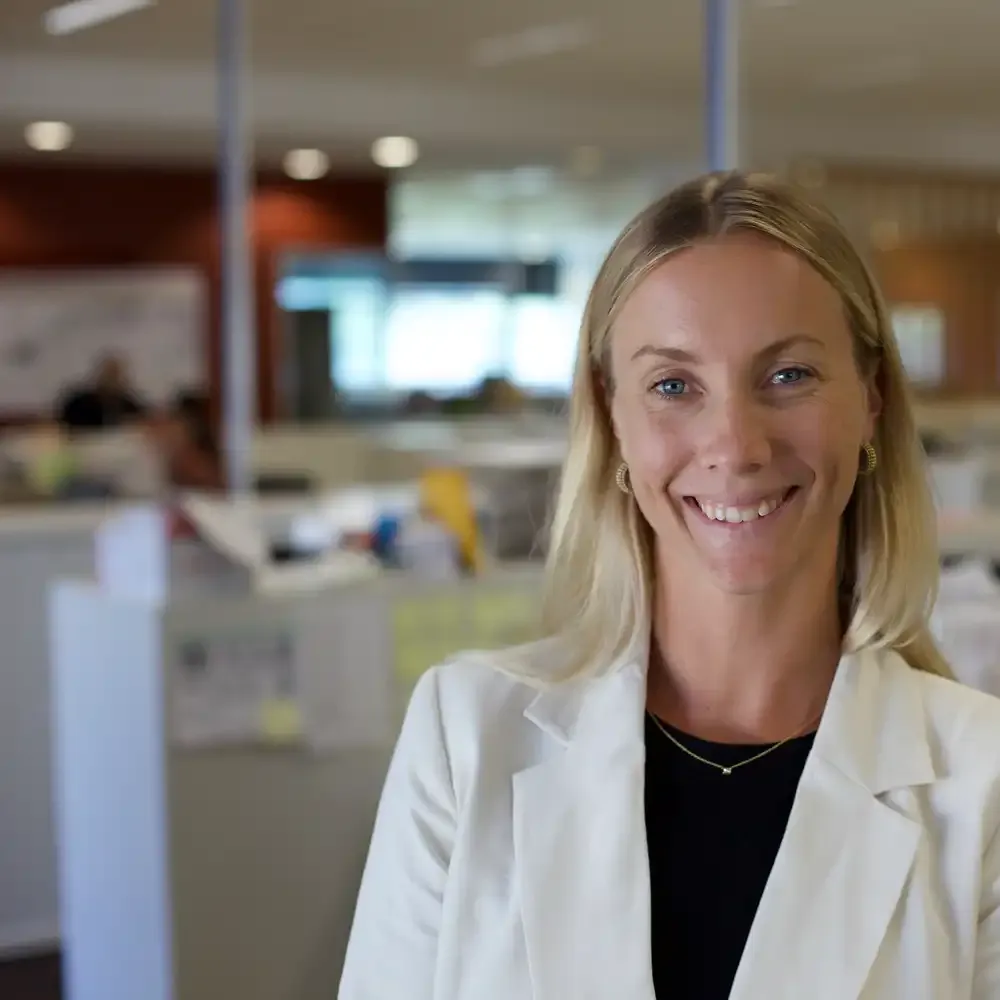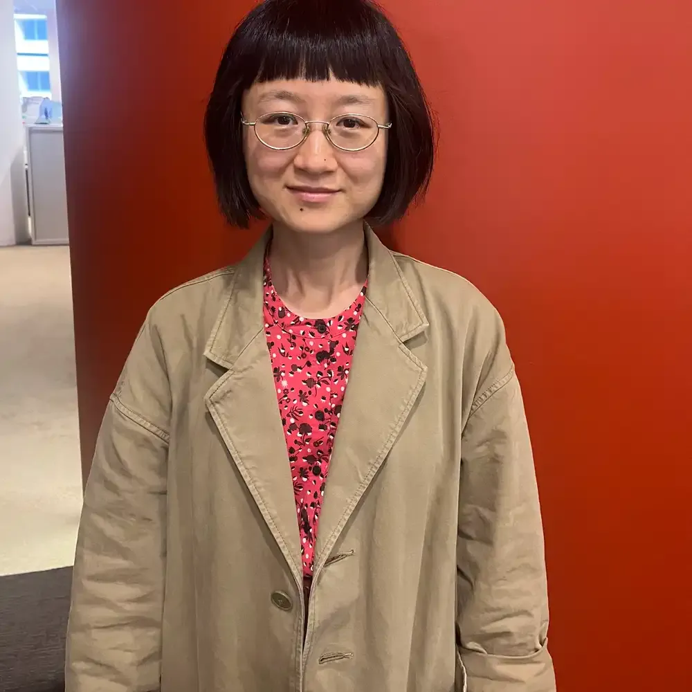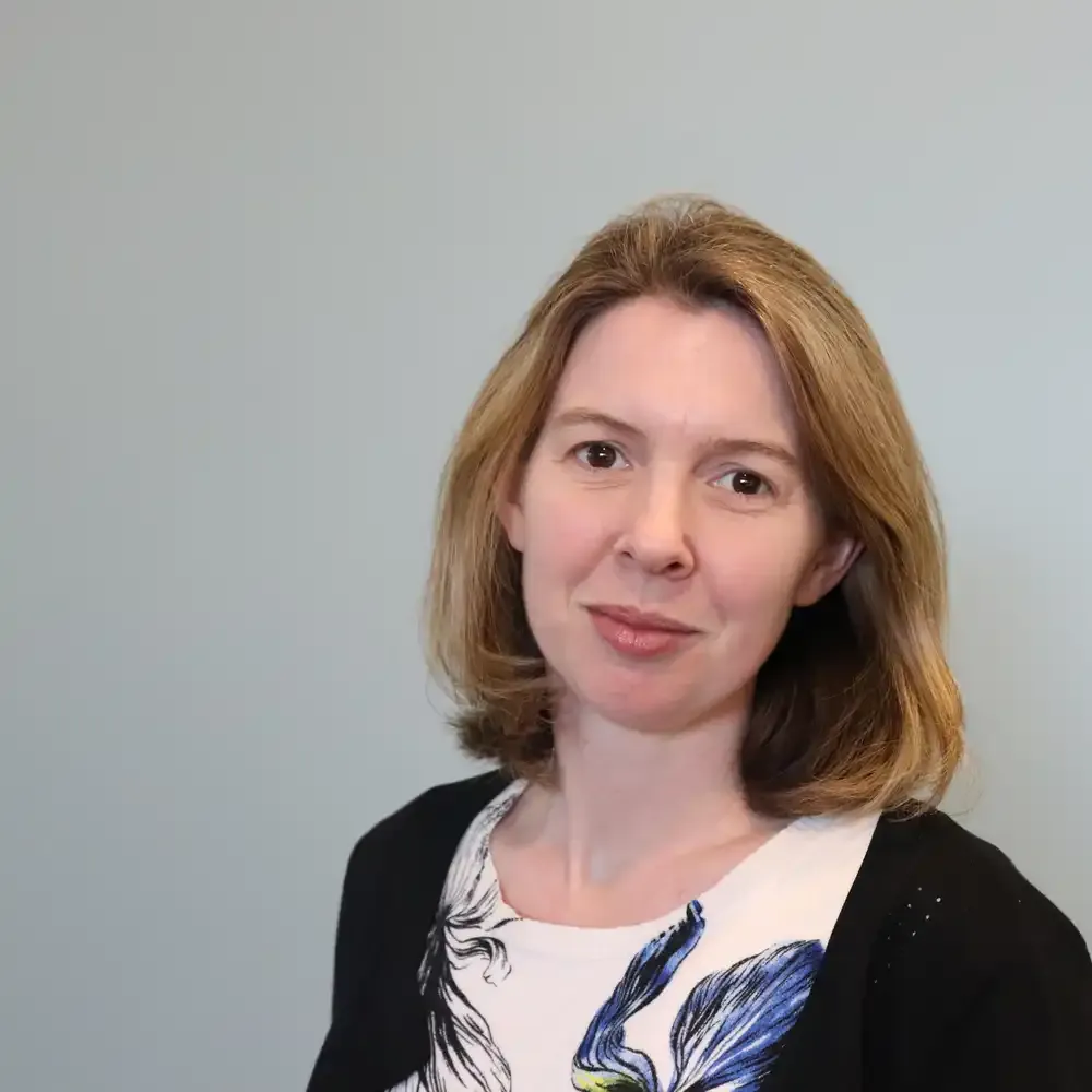 A smiling woman with glasses and blonde hair is standing in front of a red wall.