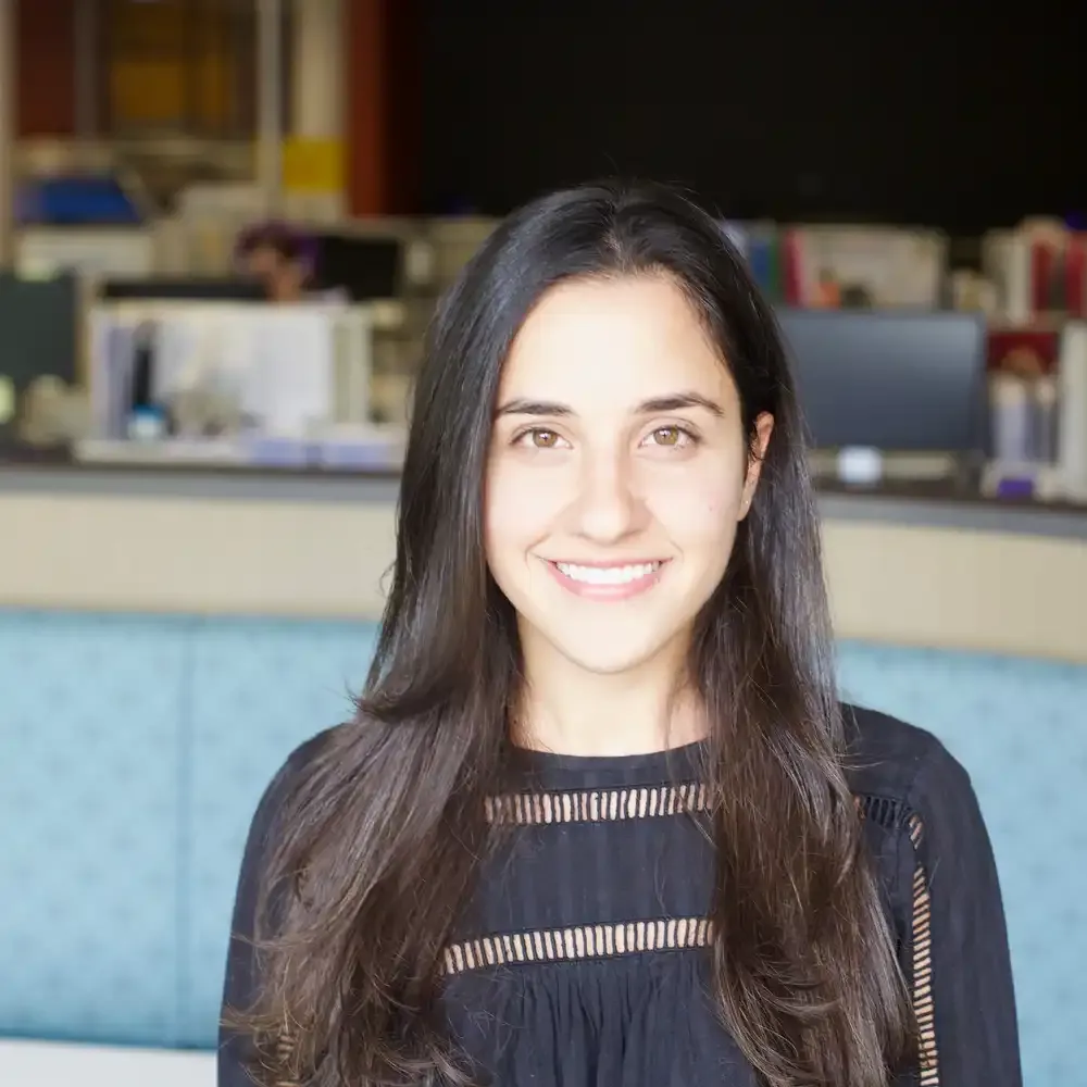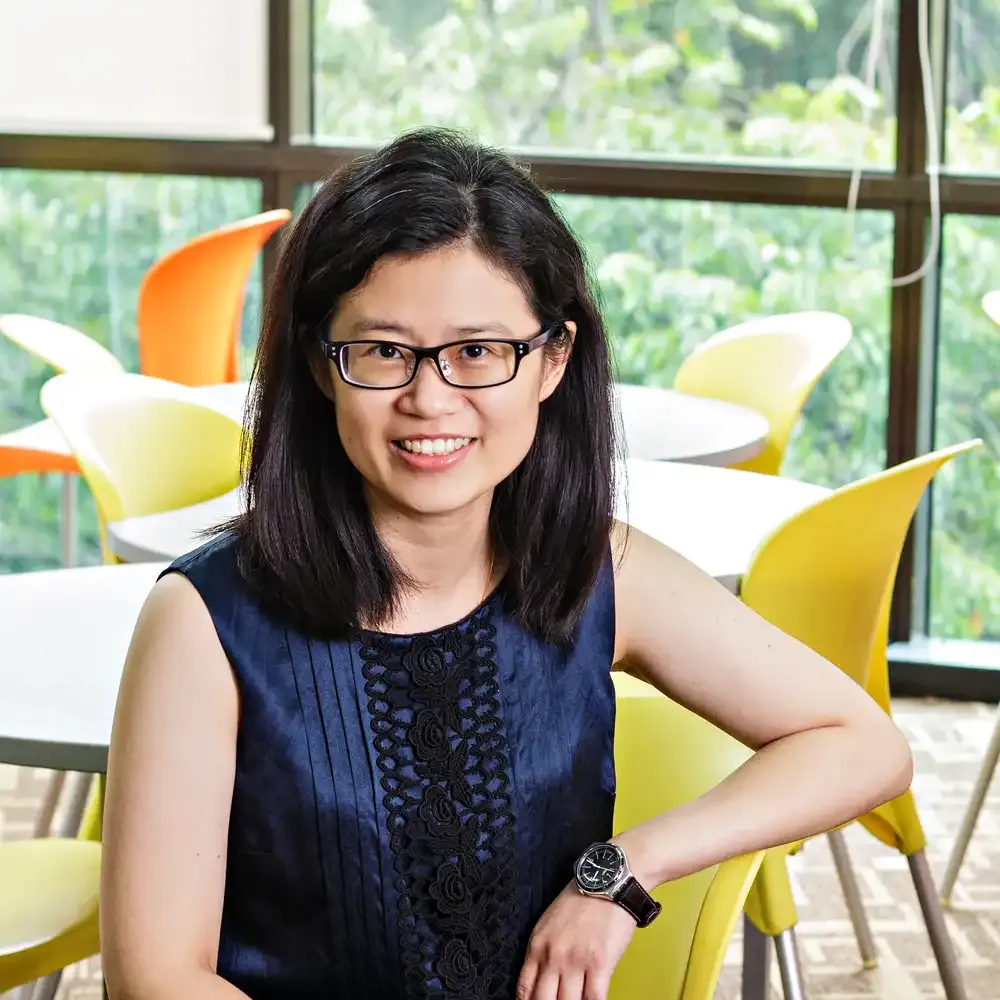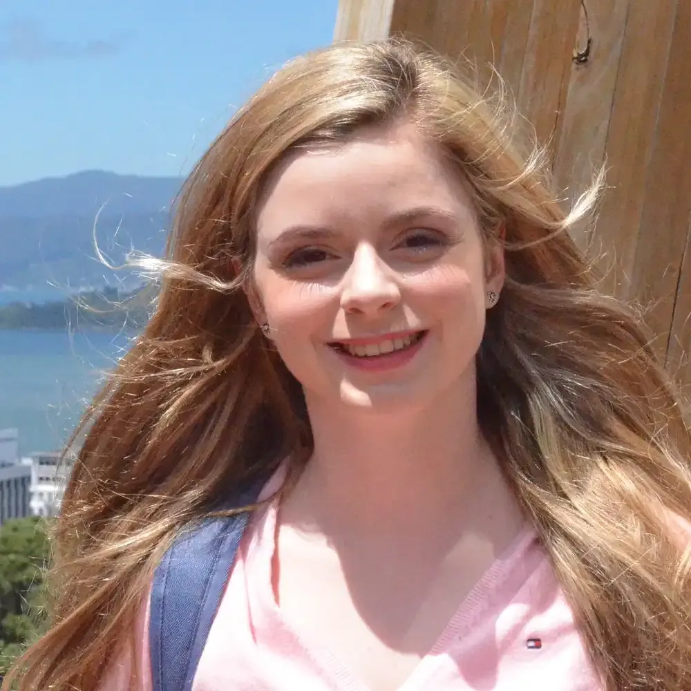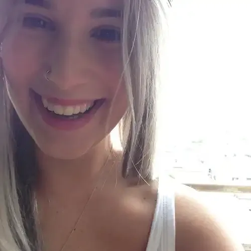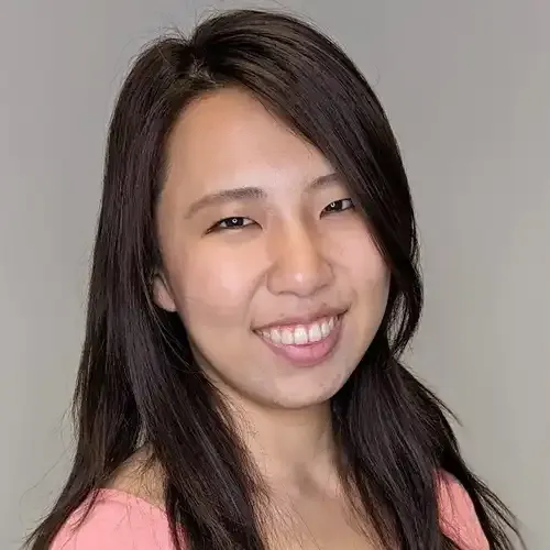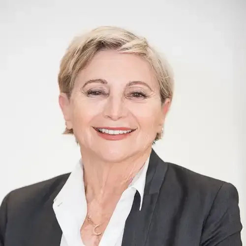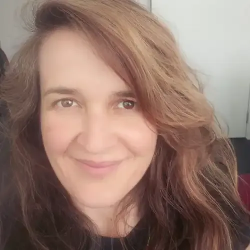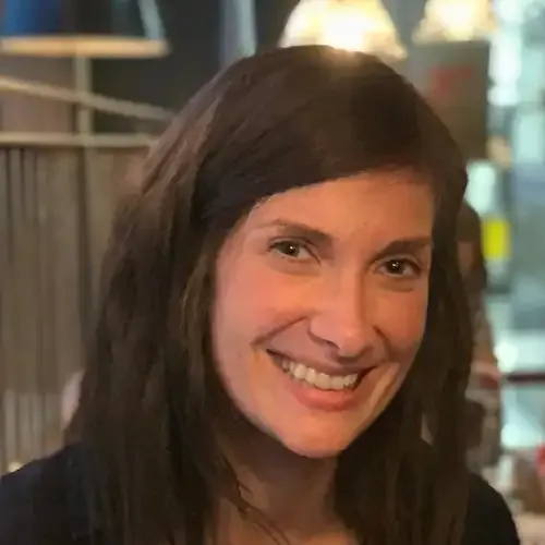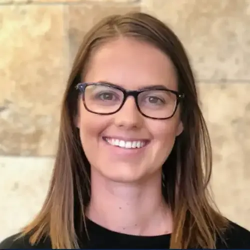A smiling woman with glasses and blonde hair is standing in front of a red wall.