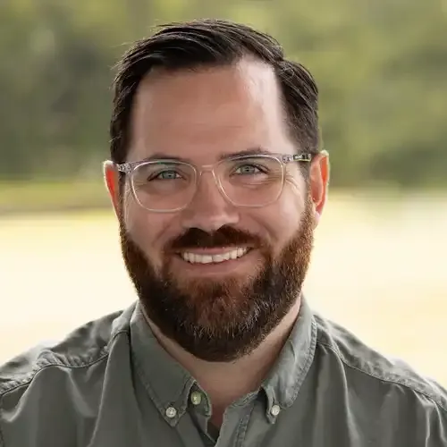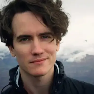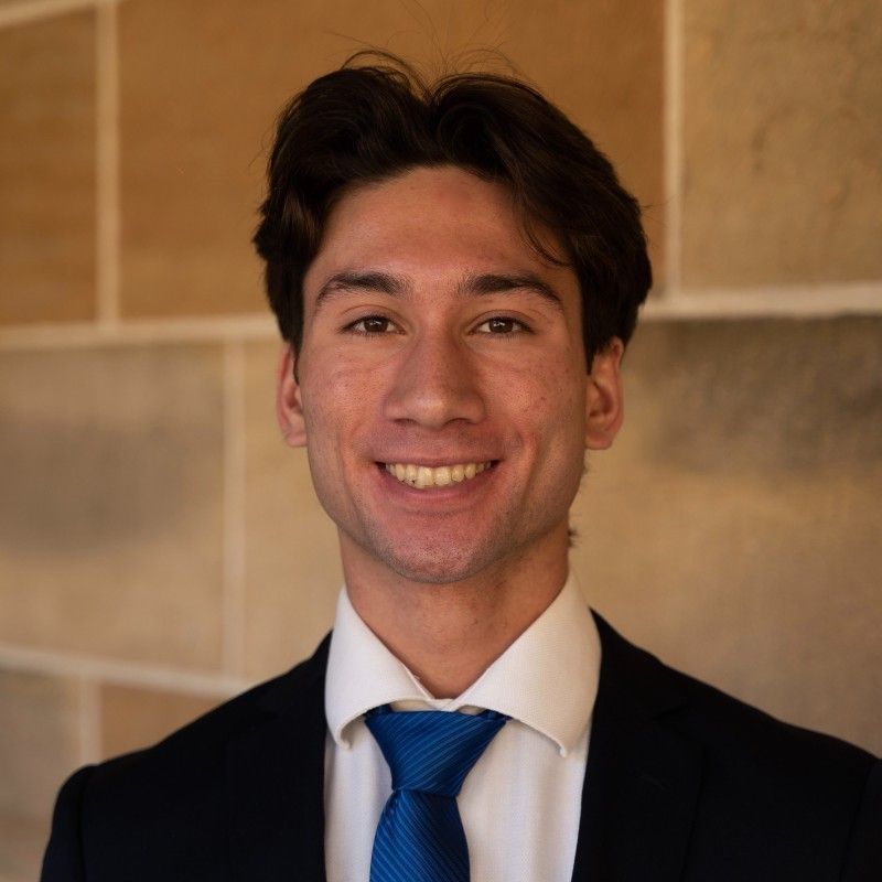 A smiling young man in a suit and tie stands in front of a brick wall.