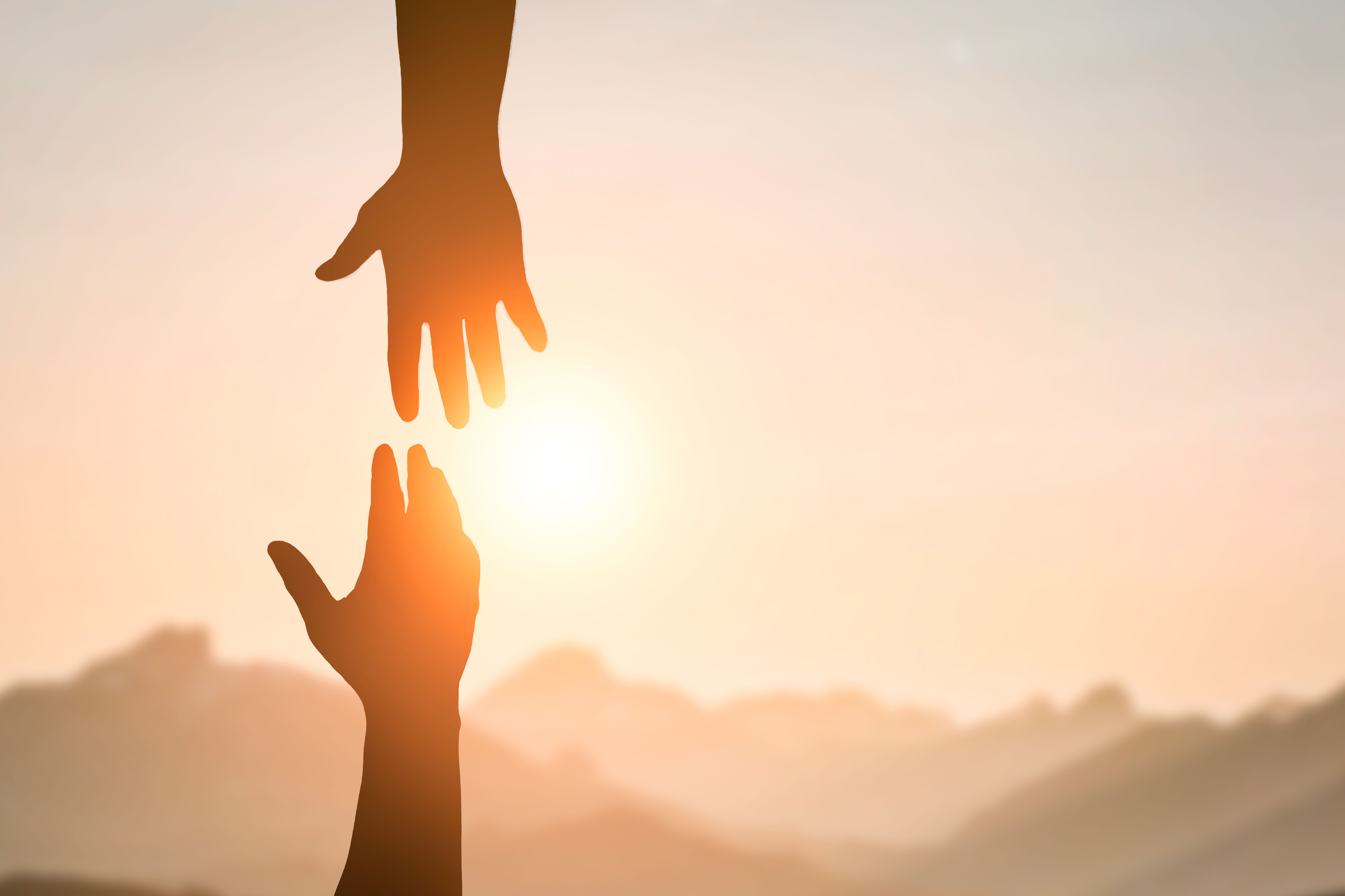 hand reaching out to another hand, sunset in the background
