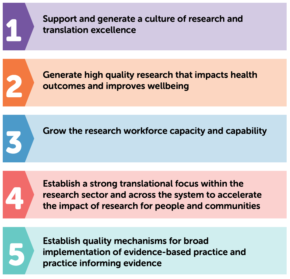 The Strategies in this document help focus our thinking and our actions. We will build on existing strengths to ensure Australia leads with a culture of research and translation excellence, we will generate high qualify research with impact and grow the research workforce. Importantly, we aim to do better with translating research from laboratories in to real world settings, and to ensure that evidence is broadly implemented across all areas within the system.