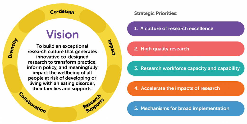 We are united in our determination to prevent eating disorders and improve the health and wellbeing of those at risk of developing an eating disorder, their families and supports in Australia. The co-designed strategic priorities, recommendations and actions outlined in this document identify how we can support that objective by improving knowledge generation and the use of knowledge in practice in Australia.