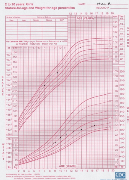 Look at the trend in weight and it is clear that her weight used to follow the 75th percentile and then from about 11 years of age her weight, although increasing, has not been increasing at the same rate as the curves. Her weight has been down crossing centiles from the 75th to the 25th percentile.