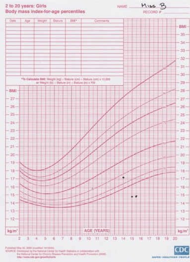The BMI is then plotted on the BMI centile charts. Miss B’s height is tracking on the 25th percentile, however, between 14 and 14 and a half years of age her weight dropped from around the 25th percentile to <5th percentile and so did her BMI.